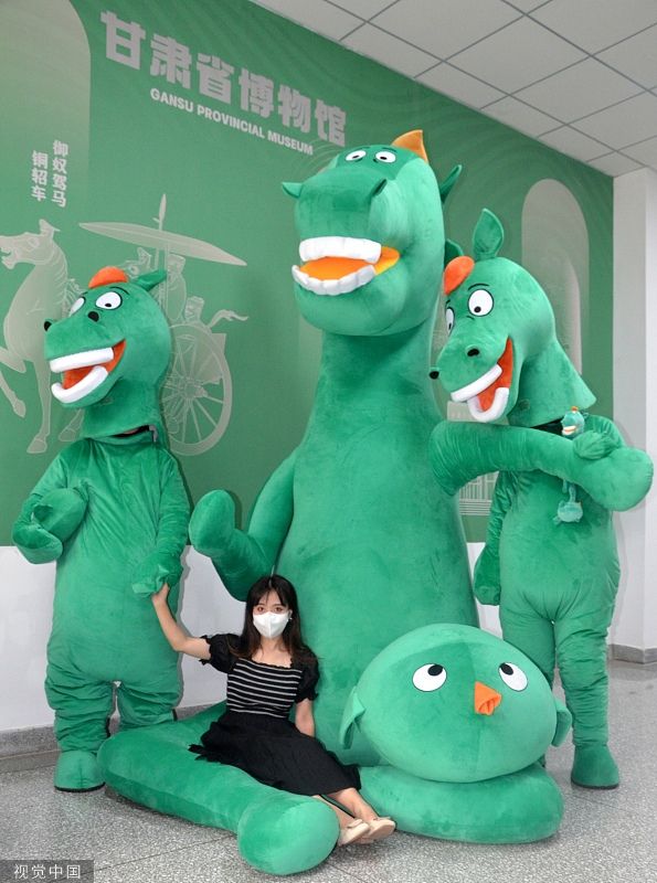 2022年8月17日,兰州,观众在甘肃省博物馆与真人版“铜奔马毛绒玩偶”合影。甘肃省博物馆设计的文创产品铜奔马毛绒玩具此前走红网络,一度售罄。近期,甘肃省博物馆推出真人版“铜奔马毛绒玩偶”,以此拉近观众与文物的距离,使博物馆的文化传播变得“更潮更有趣”。 中新社记者 李亚龙 摄