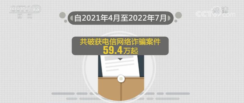 自2021年4月至2022年7月,共破获电信网络诈骗案件59.4万起。公安部会同工业和信息化部、人民银行等部门,持续强化精准预警劝阻,国家反诈中心推送预警指令1.45亿条,拦截诈骗电话28.1亿次、短信33.6亿条,封堵涉诈域名网址400万个,紧急拦截止付涉案资金5518亿元,成功避免1.09亿名群众受骗。公安部会同有关部门清理高危电话卡7769万张、行业卡1931万张。从境外教育劝返涉诈人员23万名,赴境外针对我国内实施犯罪的人员大幅减少。