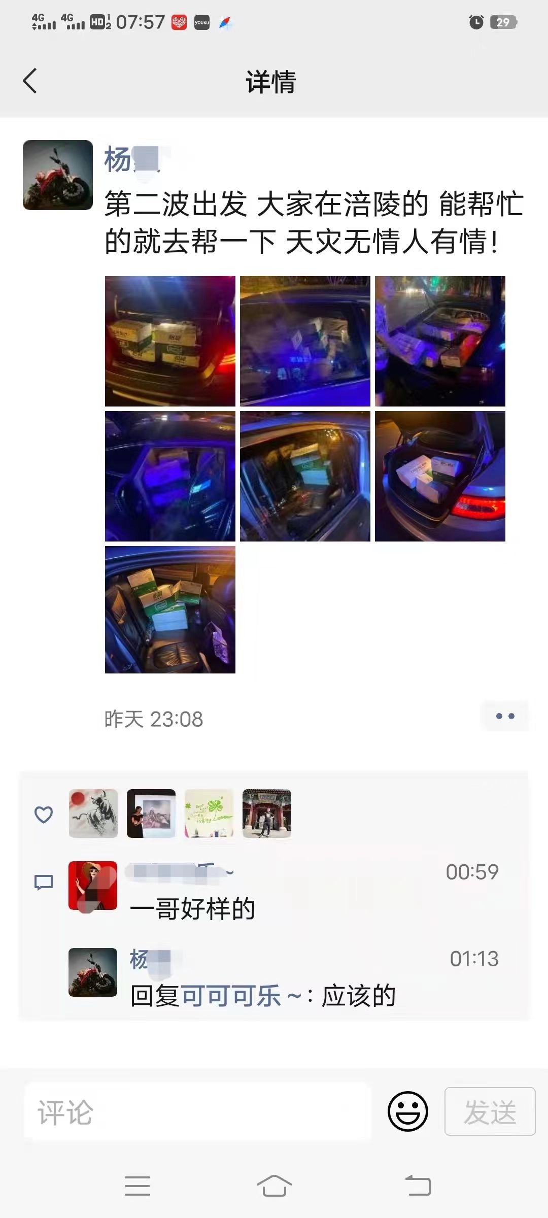 杨先生说,他发的朋友圈得到几个朋友的响应,他们开着私家车从17日晚上10点一直送到18日凌晨1点。送的物资包括矿泉水、面包、牛奶等,仅是矿泉水就有几十件。其中有2个朋友因为没法到现场,还特地转账请他为救援人员代买矿泉水。