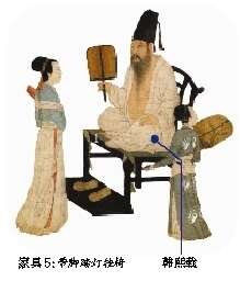 《夜宴图》中四次出现椅类图像,分别为“带脚踏灯挂椅”和不带脚踏的“灯挂椅”。在五代王齐翰的《勘书图》中就有类似的靠背扶手椅出现,其也是矮型坐具向高型坐具过渡时期的例证,但是齐备而完整的高座家具配置形成时期在北宋中期以后。画中椅子两端的搭脑向上弯曲,符合北宋的形制,与传世的《宋高宗像》中椅子搭脑的造型一致。椅子上覆盖有椅披,这是古代椅具的标准用法,椅披的使用一直延续到清代。