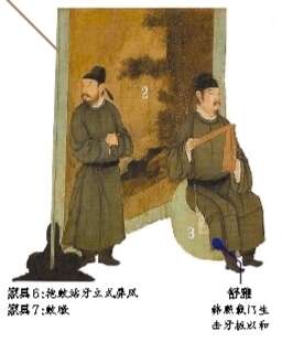 “观舞”“清吹”场景的乐师、门生都坐于墩上,坐墩在唐代绘画中就多有出现,又称绣墩,作为临时性家具,制式级别没有带靠背的椅类级别高,对应坐在墩上面的人的地位也比坐在椅类上的人低,《夜宴图》画面中多为乐师、门生坐在墩上,士大夫等人皆坐椅,即有此地位差别的体现。