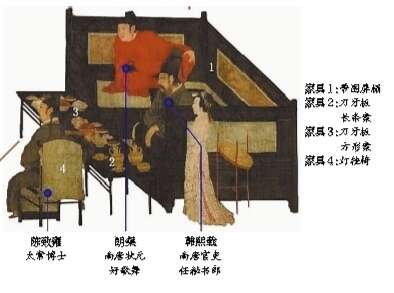 《夜宴图》中的家具如“刀牙板长条案”“刀牙板方形案”等家具,作为小木作借鉴了中国古代建筑大木作构架的制式,形成框架式结构,奠定了中国传统家具的基本结构形态。以画窥史,观古知今,《韩熙载夜宴图》中的家具体现了当时贵族的审美特点和家居品位,也可以看出五代时期,是家具由低向高过渡趋于完善的特定时期,家具整体组合意识明显,功能性家具分区明确。画中家具形态简洁,结构上皆无过多的装饰,相比于唐代厚重华贵的风格,五代时期的家具已然开始喜爱轻便、简化装饰,体现唐代华丽风格到宋代简约风格转变过渡时期的家具风貌,是对宋代家具素雅质朴之风的重要铺垫。