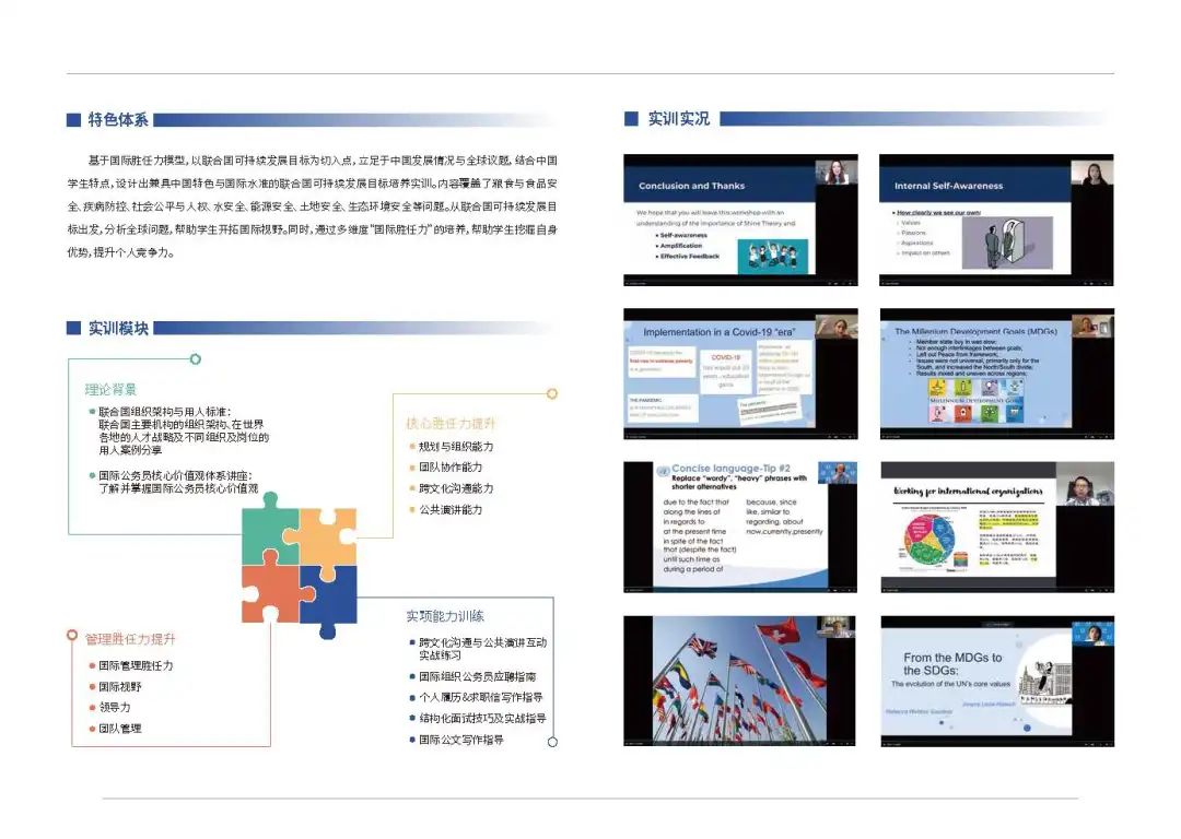 自2021年来,学校以国家需求为导向,搭建工作平台,创新课程建设,积极开展全球胜任力培养、国际组织人才和新时期国际交流合作人才培养工作。依托学科布局和专业特色制定了全球胜任力人才培养五年目标和规划,并成功获批教育部中外人文交流中心高层次国际化人才培养创新实践项目学校、中国教育国际交流协会新青年全球胜任力人才培养项目学校,加入中国教育发展战略学会国际胜任力培养专业委员会并担任理事单位。