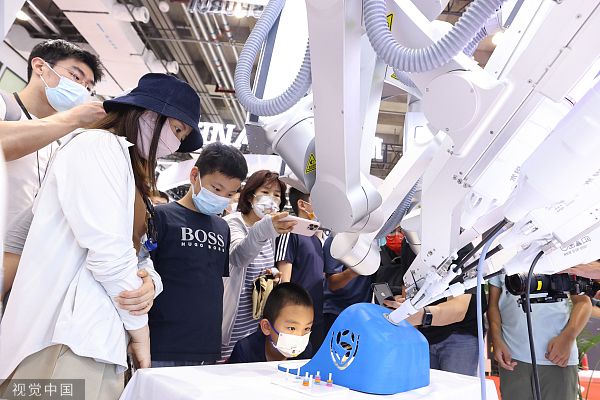 8月18日至21日,2022世界机器人博览会在北京亦创国际会展中心举行。众多观众在做好防疫的情况下,有序观展。本届博览会首次打造“机器人+应用场景”的展示形式,共有130余家企业携500余件展品“炫技”高精尖,30余款全球首发新品集中发布。