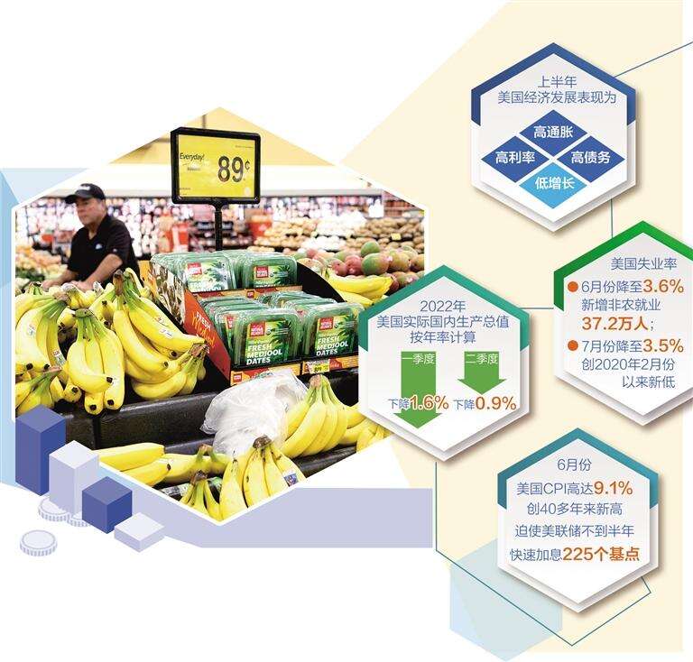 2022年一二季度,美国实际国内生产总值按年率计算分别下降1.6%和0.9%,出现技术性衰退。但在经济走弱的同时,美国失业率7月份却创出3.5%的2020年2月份以来新低,就业表现强劲。