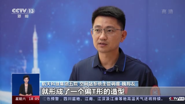 航天科技集团五院 空间站系统主管调度 魏邦友:梦天实验舱在发射对接的时候,就形成了一个偏T形的一个造型。紧接着梦天实验舱也进行一个转位到二象限,这样就真正实现了咱们这个空间站的T字形。