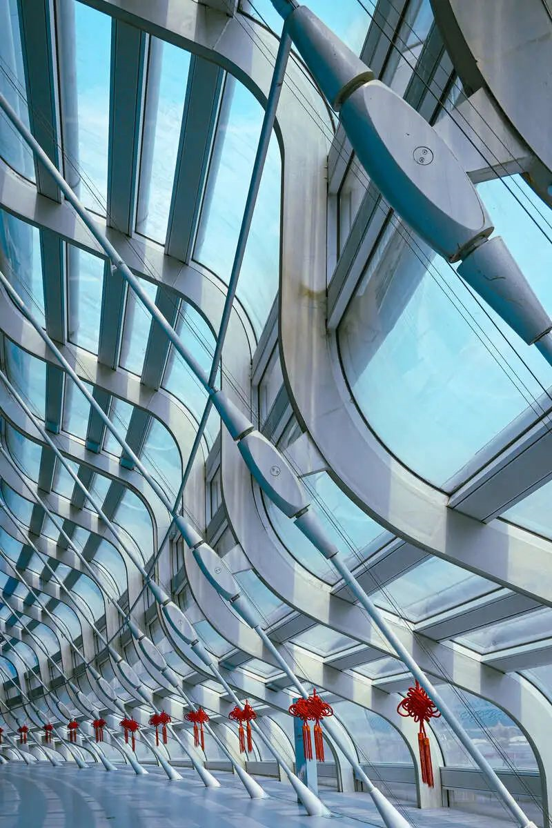 国家速滑馆外侧幕墙天坛曲面。外侧幕墙使用了120根斜拉索进行支撑,由3360块曲面玻璃单元拼装而成,每一块玻璃都有不同的弯曲弧度,通过机械配合人工操作,完美地嵌入160根S形钢龙骨打造的框架中。