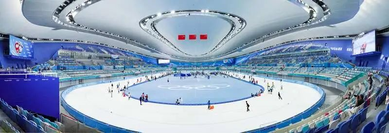 国家速滑馆“冰丝带”馆内全貌。“冰丝带”馆内银色穹顶下,冰面洁白透亮。支撑起其“外衣”的是一副钢结构主受力“骨架”,包括世界跨度最大的单层双向正交马鞍形索网,8500吨的环桁架和120根外侧幕墙斜拉索。“骨架”虽由钢材料打造而成,却显得轻灵、飘逸。“冰丝带”钢结构工程也由此荣获中国钢结构金奖。