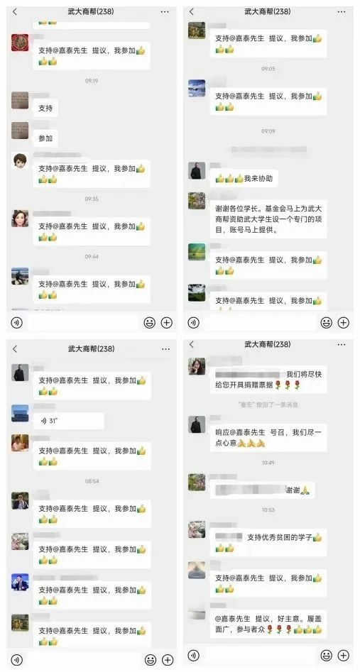 善意未止步于此,更大的惊喜出现了。19日上午8点46分,在得知了杨茂清自强不息的事迹和校友资助的消息后,杰出校友陈东升在“武大商帮”群里发出倡议,号召群里所有校友企业家每人不低于一万元,上不封项,设立一个面向优秀农村贫困学子持续四年资助的助学金。