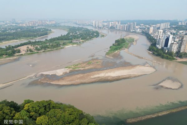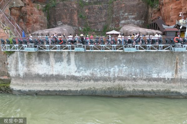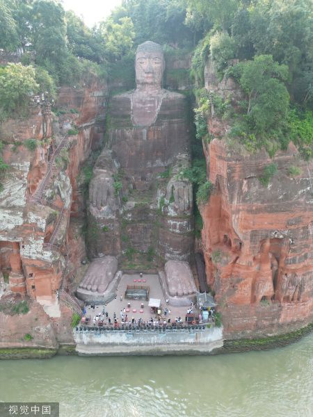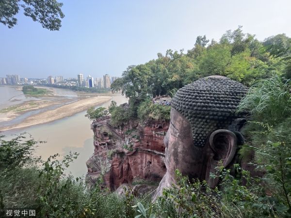 2022年8月20日,受持续高温、降水偏少的影响,四川省乐山市境内大渡河、青衣江和岷江水流量明显减少,位于三江交汇处的乐山大佛“真身”也全部露出,吸引不少游客前来游览。目前,乐山大佛平台水位海拔高度仅约354米,与往年8月同期正常水位相比低了近2米。 中新社记者 张浪 摄
