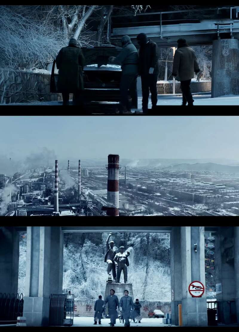 穿戴着棉捂子、棉手套的人带着腾腾热气从车上走下来,绿皮火车伴着它惊天动地的轰鸣声驶过;再拉远景时,北方雪色苍茫,大地喑哑暗淡,高高的烟囱耸立着、刺破着这灰黑色的静;钢铁结构的城市,雕像摆出雄赳赳的挺进的姿势,人们照常在工厂忙碌,不合时宜的枪声却响起……