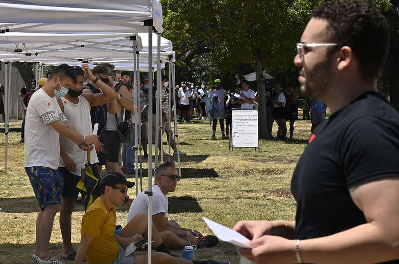 资料图:当地时间2022年8月6日,美国加州民众排队接种疫苗。