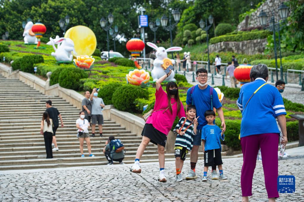 中秋临近,澳门市政署在大三巴牌坊前设置中秋节日灯饰,让市民和游客感受传统节日气氛。