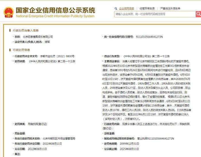 信息显示,当事人经营位于北京市朝阳区工体西路6号处的天堂超市酒吧。今年6月,天堂超市酒吧发生聚集性疫情引发广泛关注。(中新财经)