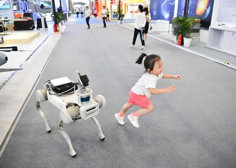 基于多无人系统立体巡检成套技术装备的“四足仿生机器狗”逗乐小朋友。记者 谢智强 摄/视觉重庆
