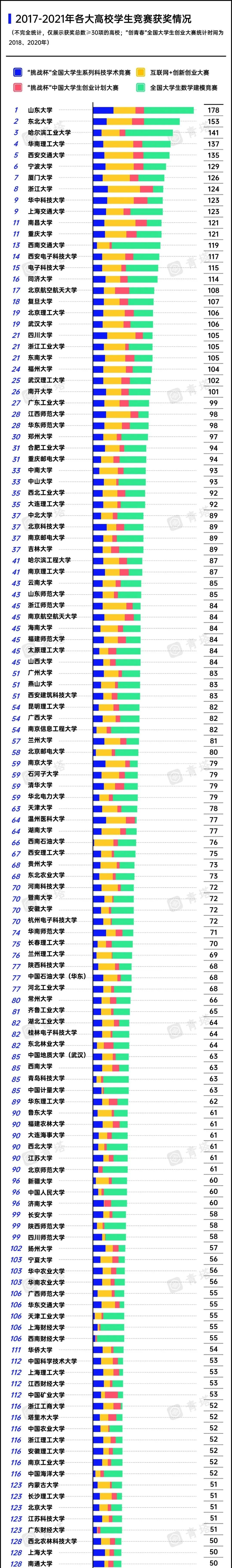 从竞赛总获奖情况来看,山东大学表现最佳,斩获178项,位居第一;