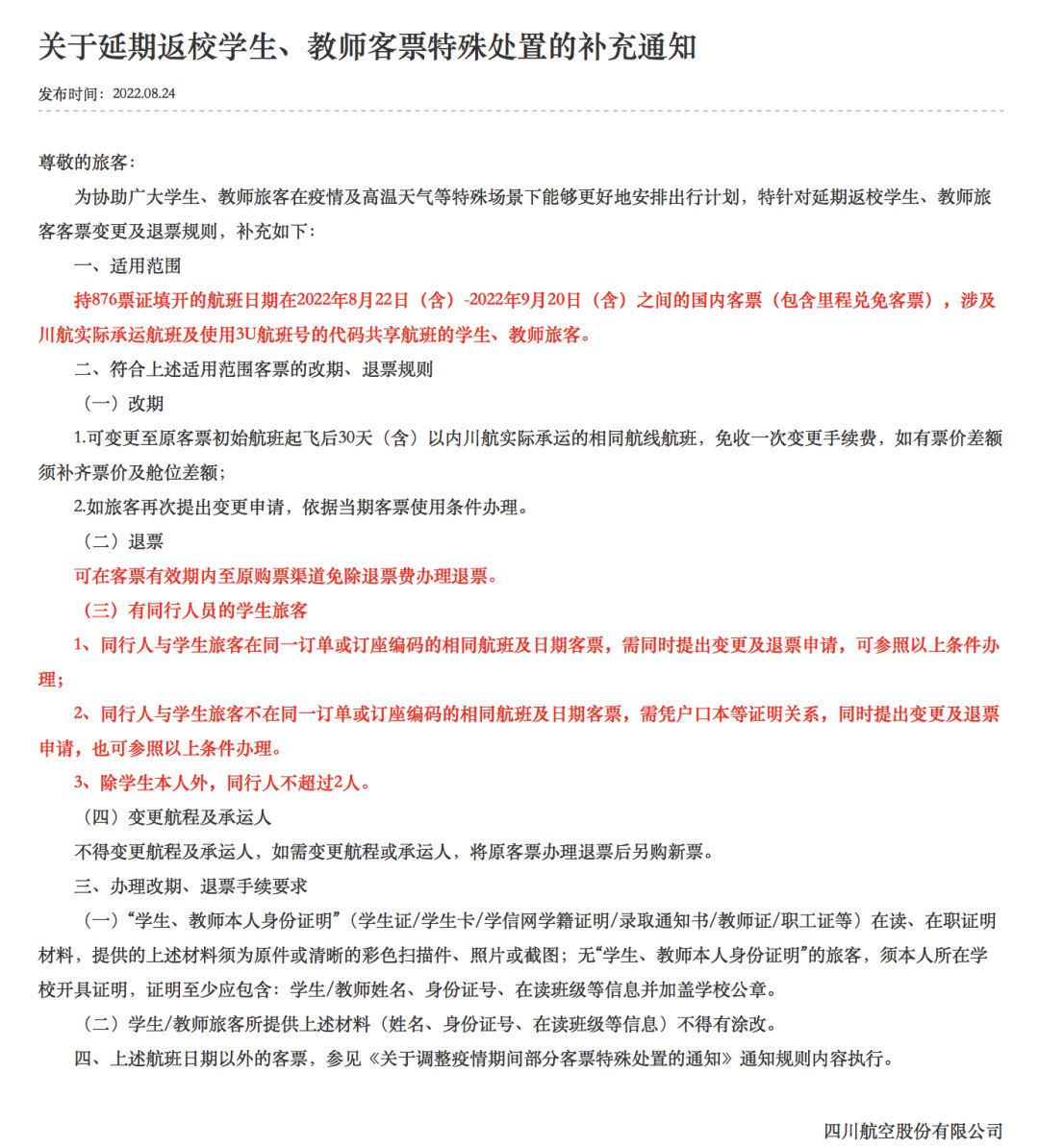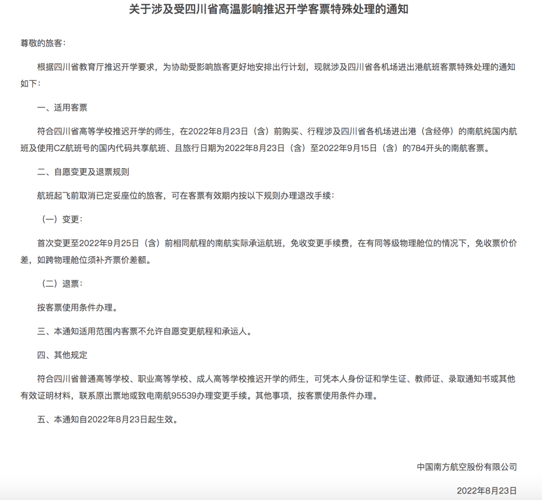 8月23日,中国南方航空发布《关于涉及受四川省高温影响推迟开学客票特殊处理的通知》: