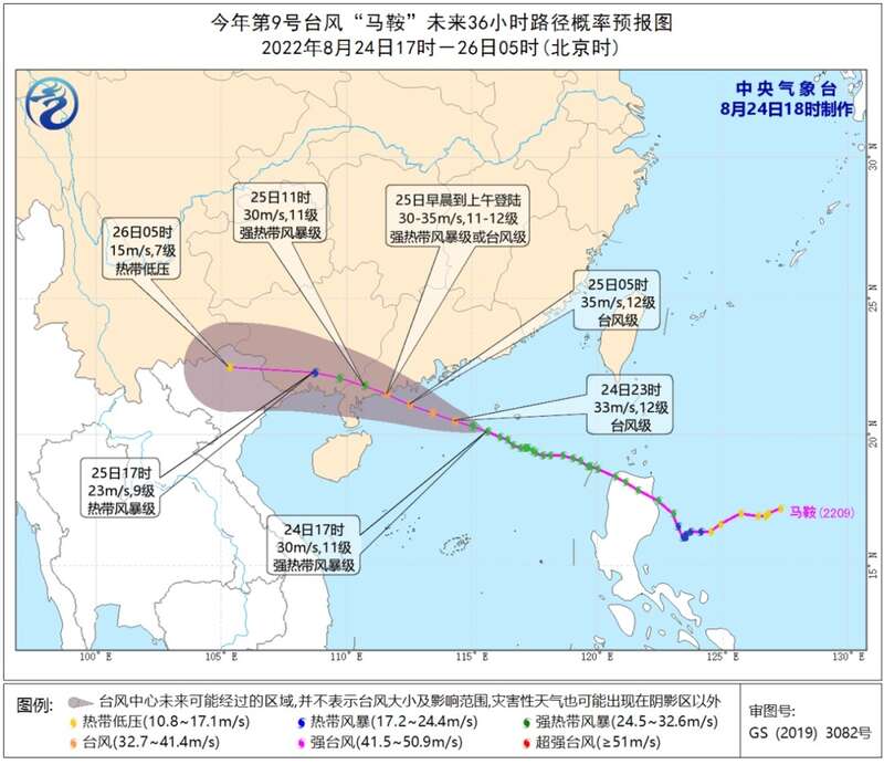 根据中央气象台最新预报,“马鞍”将于明天早晨到上午在广东台山至吴川一带沿海登陆(30-35米/秒,11-12级,强热带风暴级或台风级),登陆后强度逐渐减弱。