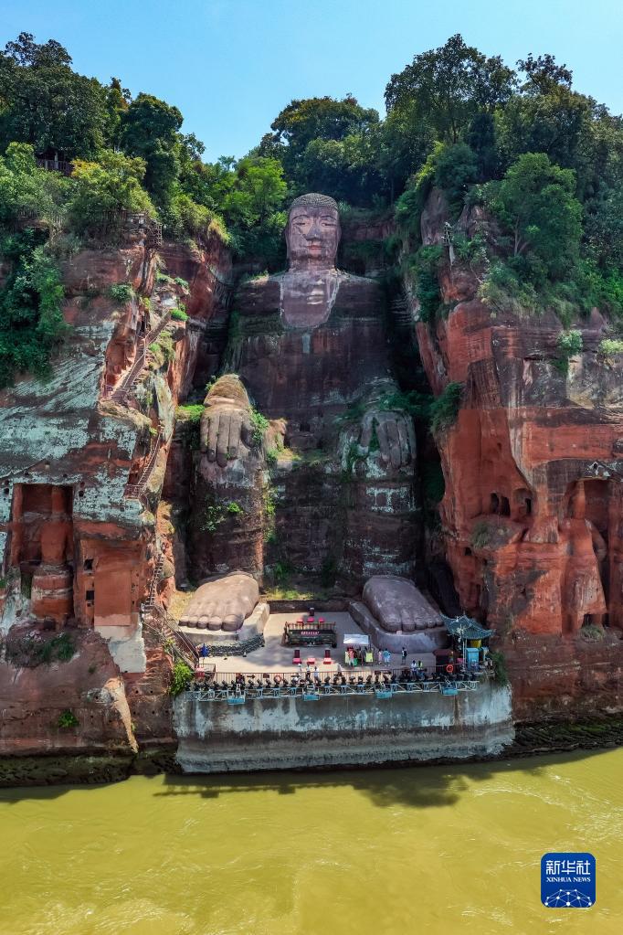 这是8月23日拍摄的露出底座的乐山大佛(无人机照片)。