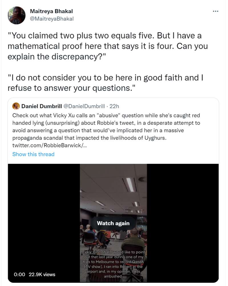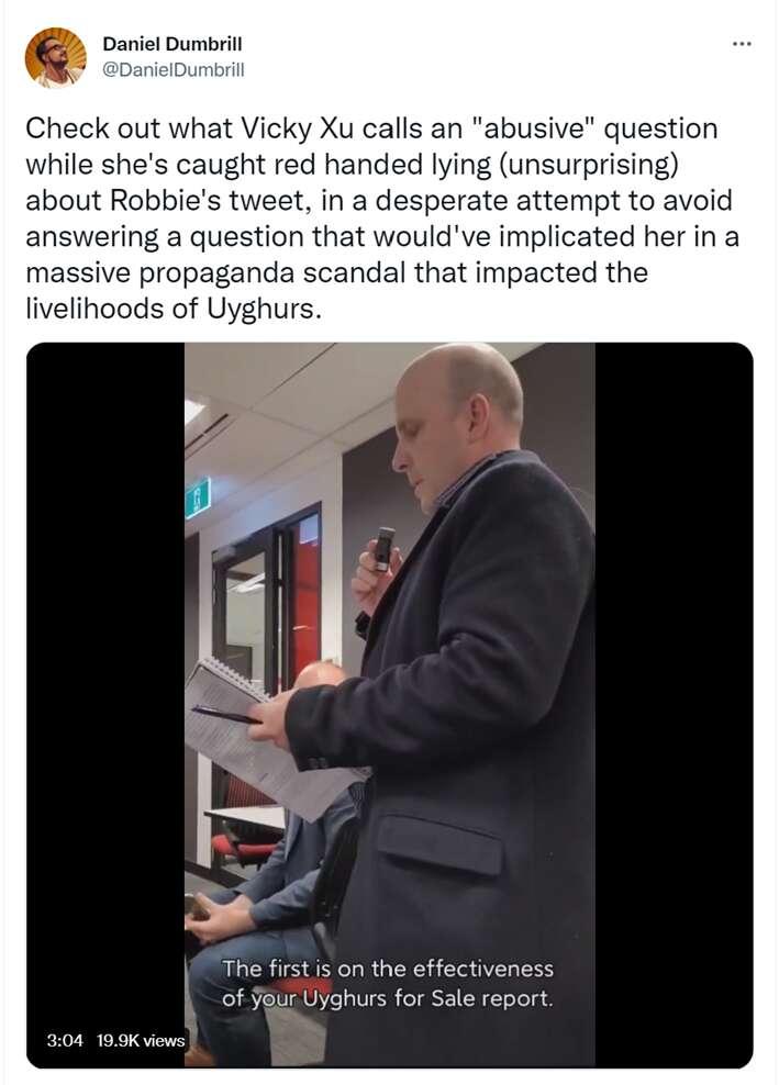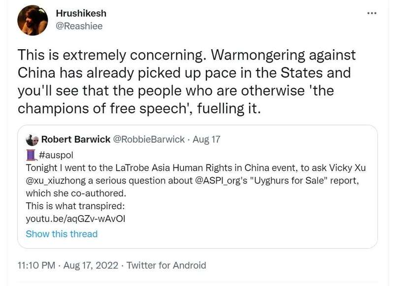 2022年8月17日,在一个讨论中国人权问题的论坛上,澳大利亚公民党资深研究员罗伯特·巴维克(Robert Barwick),向前澳大利亚战略研究所研究员许秀中(Vicky Xu)提出了这样一个问题。三分钟之后,罗伯特被驱离会场,因为许秀中拒绝回答这个问题。