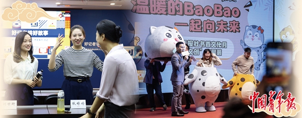 右:2021年10月25日,北京,“温暖的BaoBao 一起向未来”中国青年报社书香文化月“青·文创”欢聚荟活动上,主持人和年轻报人展示中国青年报IP“青小豹”“豹小花”,推广中国青年报社的青文创产品。中青报·中青网记者 李峥苨/摄