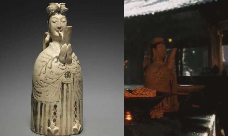 而在插曲《戒网》的MV中,桌上还放置着一只人形的壶,造型是一个抱着乐器的仙人,仙人的身体是容器,手中的乐器则是出水口。这个壶几乎与现藏于美国克利夫兰艺术博物馆的辽代仙人吹笙执壶一模一样。