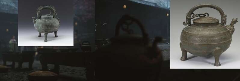 而庭院中摆放准备宴席的六张案几上的物品,同样有其原型。例如一尊青铜酒器,腹部浑圆,顶部有盖,带提梁,由多个环套链接,嘴部似鸟,而三足则似兽。这一形象与上海博物馆展出的战国晚期的春成侯盉十分相似。盉是东周时期装酒或水的容器,上海博物馆还藏有另一件吴王夫差盉,同样是圆身、三兽足、带提梁和环钮,只是花纹更加繁复。
