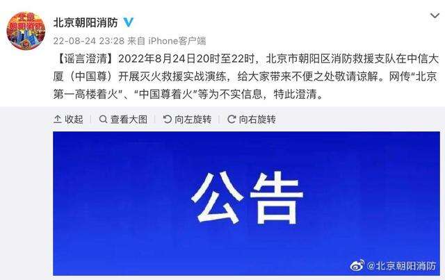 @北京朝阳消防 微博8月24日晚发布谣言澄清公告。2022年8月24日20时至22时,北京市朝阳区消防救援支队在中信大厦(中国尊)开展灭火救援实战演练,给大家带来不便之处敬请谅解。网传“北京第一高楼着火”、“中国尊着火”等为不实信息,特此澄清。