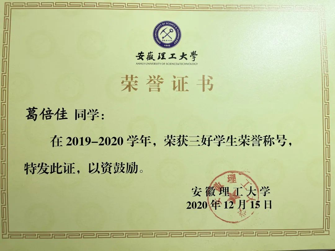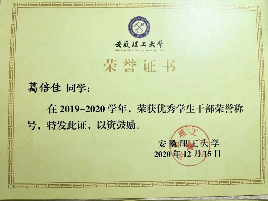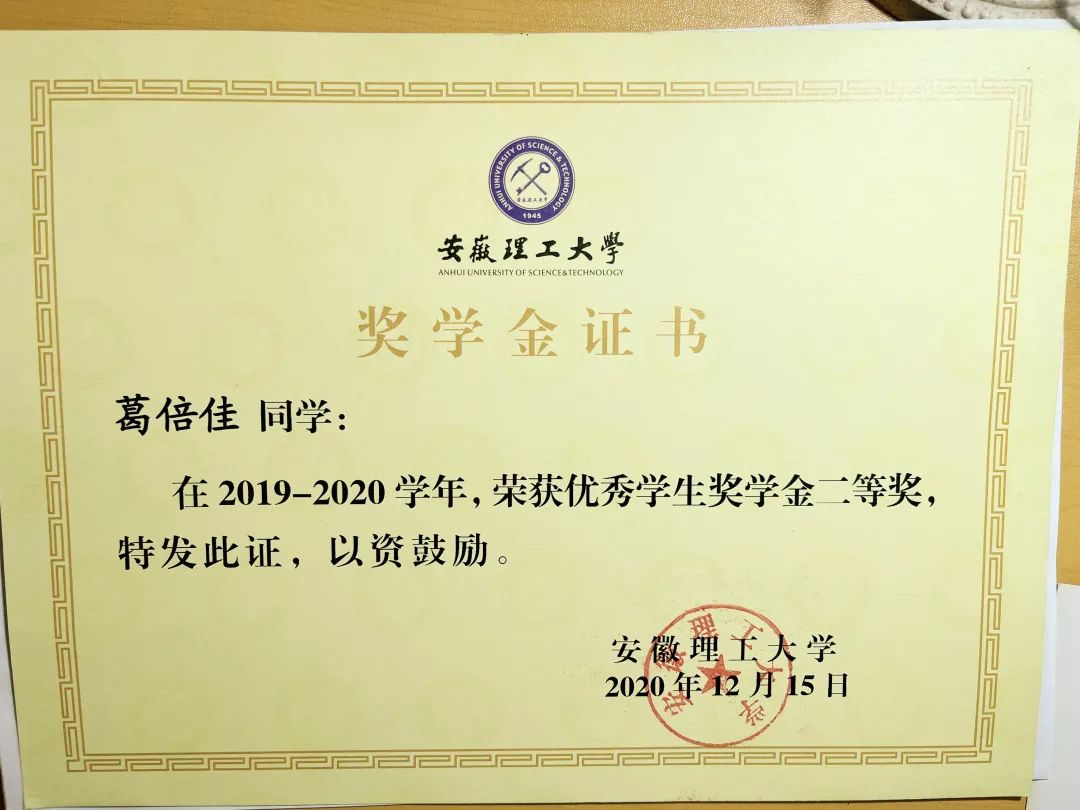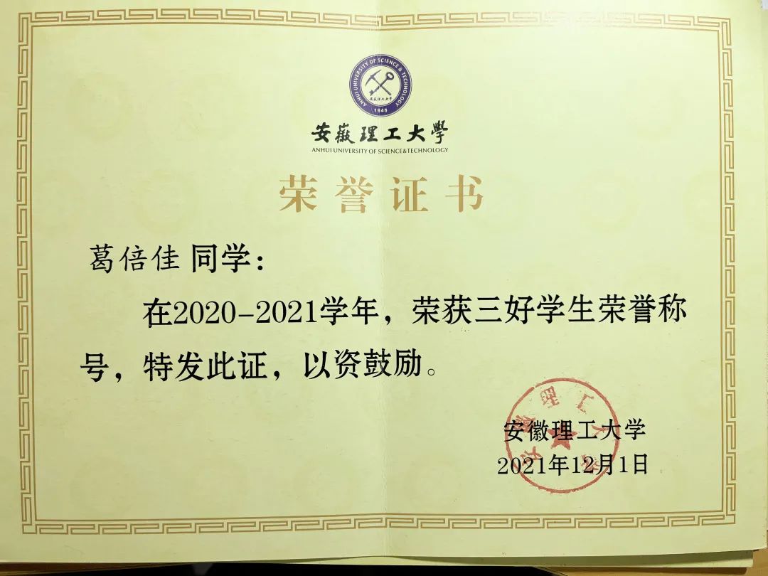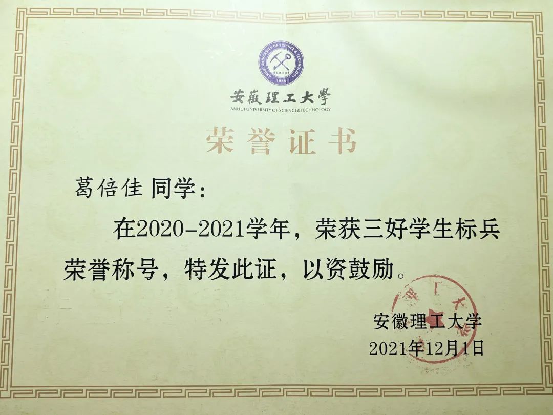 葛倍佳,中共预备党员,力学与光电物理学院光电信息科学与工程专业2019级本科生。2020-2021学年综合测评名列专业第一。获得2021年度国家奖学金,曾获安徽理工大学三好学生、三好学生标兵、优秀学生干部、优秀共青团员、校二等奖学金……。她积极参加各类学科竞赛,曾获得第十四届“认证杯”数学建模网络挑战赛特等奖、2021年安徽省大学生物理学术竞赛三等奖、中国数学建模比赛省三等奖……此外,与她可爱的外在形象形成较大的反差的是,葛倍佳还是一位跆拳道黑带选手,她小时候就开始了跆拳道的练习,13岁就获得跆拳道黑带。“你们的理想与热情,是你航行的灵魂的舵和帆。”青春,就像是一次航行,“以热爱为帆,以坚持为舵”贯穿了葛倍佳的成长经历,即使遭遇再大的风浪也能勇敢面对。今天,让我们一起走近这位保持热爱、奔赴山海的宝藏女孩吧!
