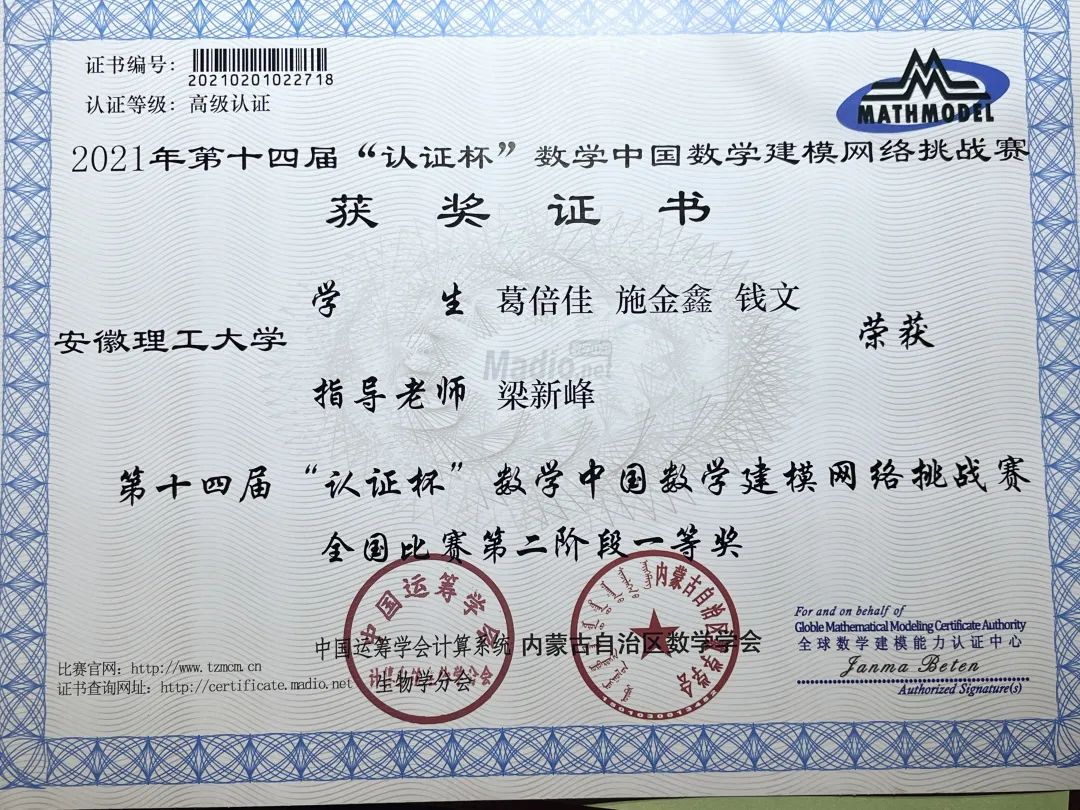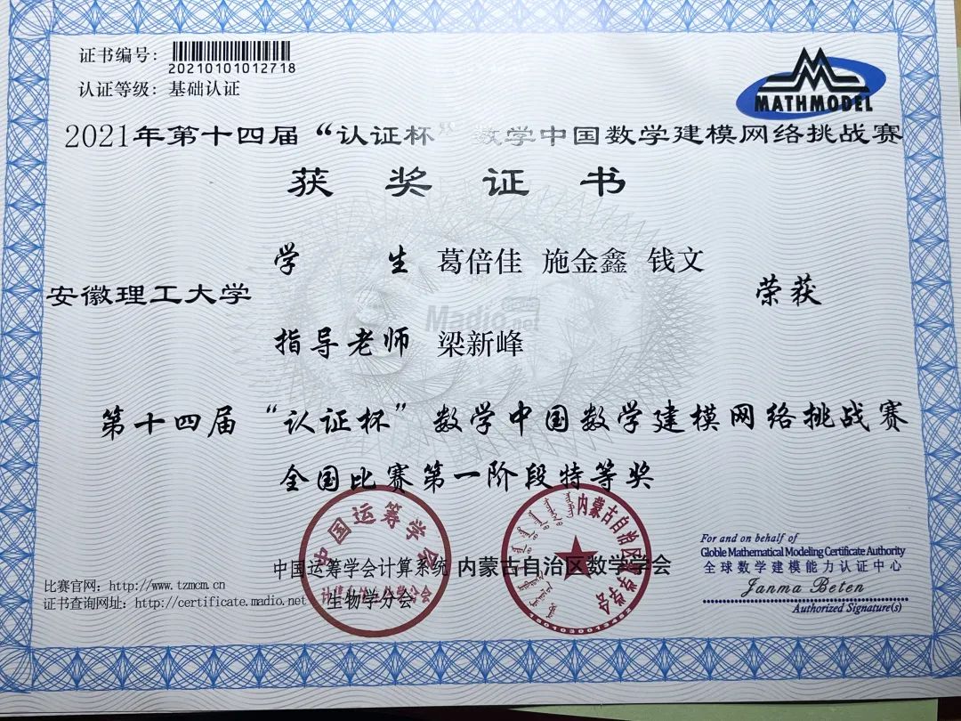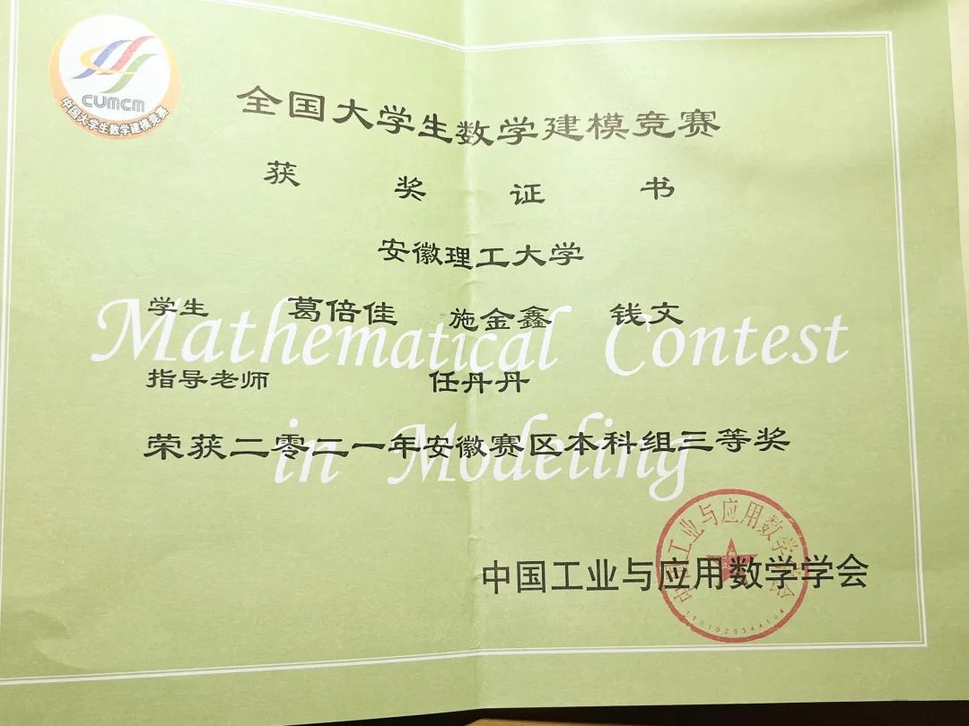 除了本专业类的物理学术竞赛,葛倍佳还参加了第十四届“认证杯”数学建模网络挑战赛。“最开始参加数学建模是老师的推荐,参加了比赛之后,我真正了解到了数学建模的魔力。”博观而约取,厚积而薄发。对数学建模缺乏一定的知识储备,给葛倍佳的前期学习带来了不小的困扰,“不是很了解数学建模,很长一段时间都处于懵懵懂懂的状态。”为了弥补自己和别人的差距,葛倍佳收集资料、制定规划、交流思想,一直到参加老师安排的系统性培训,从未松懈。葛倍佳和另外两位同学参赛的选题为医学图像的配准,“确定好题目之后,便各自分工。各司其职的同时,为了整篇论文的连贯性,我们保持着高度统一的作息。”谈及比赛经历时,她如是说:“我总是会在建立模型,或者选择相关方法的时候遇到瓶颈,更多的还有心理上的压力。不过很感谢队友和老师的鼓励。第一次参加大型比赛,我的内心十分慌张。对自己不自信,瞻前顾后,感觉到自己被束缚了一样。我的队友们感受到了我的紧张,一直给我鼓励让我放手去做,老师也一直告诉我们:‘不要害怕,做出自己的样子就是最好的答卷!’回想起来,我非常感谢他们的鼓励,也十分怀念那段忙碌且充实,不断成长的日子。”最终,团队获得了“认证杯”挑战赛特等奖。键盘上的指印是勤奋刻苦的最好见证,她的脚步不止于此,最后在全国数学建模比赛中荣获省三等奖。“数学建模真的是有一定难度的,我也想过要放弃,但是我已经走到了这一步就不能松懈自己的态度,”咬定青山不放松,这份毅力是她破冰而出的利刃,同样也是她最闪亮的地方。