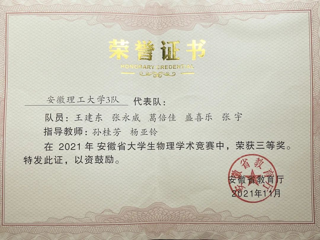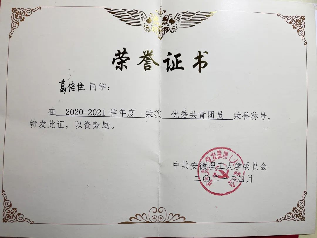“只要是兴趣所在,我便想要亲自尝试。”在大一的时候葛倍佳就对大学生物理学术竞赛产生了浓厚的兴趣,“我的专业本就和物理挂钩,当我在大一看到学长学姐做竞赛实验时,我就特别感兴趣,就觉得做实验、做好实验是一件很酷的事情。”因着这份热情,葛倍佳在大二时抓住机会,并成功入选参赛队伍,参加了2021年安徽省大学生物理学术竞赛。“我最开始的实验项目是海绵吸水,但是在着手准备实验仪器、完善实验各项指标的时候,遇到了很多问题:变量太多、仪器的精密度过低、操作难度过大,在和团队成员和老师沟通后,我决定更换实验内容。”这对于葛倍佳来说是十分艰难的,“我当时非常紧张,生怕因为自己的变故拖了整个团队的后腿。”更换了新的项目,葛倍佳深知自己的进度较慢,便着手开始收集资料,借着第一个项目的前期准备积攒的经验,她的实验很快就步入正轨。最终,葛倍佳所在队伍获得物理学术竞赛三等奖。回顾竞赛,葛倍佳深有感触,“这场学术竞赛真的让我受益匪浅,大家虽然做的实验不一样,但是彼此交流思想的时候总会给我带来新的灵感,一起努力共同进步的那段时光真的十分珍贵!”她握在手里的便不仅只是知识,更有坚韧的品性,攻克困难的决心。“这是我印象最深的比赛,兴趣使然,便是满怀期待和喜悦的努力着!”