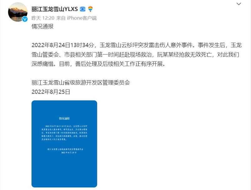 8月25日,云南玉龙雪山管委会官微通报称,8月24日,玉龙雪山云杉坪突发雷击伤人意外事件,阮某某经抢救无效死亡。目前,善后处理及后续相关工作正有序开展。此前,涉事景区工作人员向澎湃新闻证实,24日,一对新人拍婚纱照时,新郎遭雷击不幸去世。