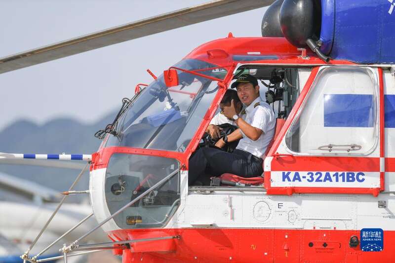 8月28日,在重庆龙兴通用机场,来自四川广安的救援直升机机长在准备起飞前向送行人员示意。