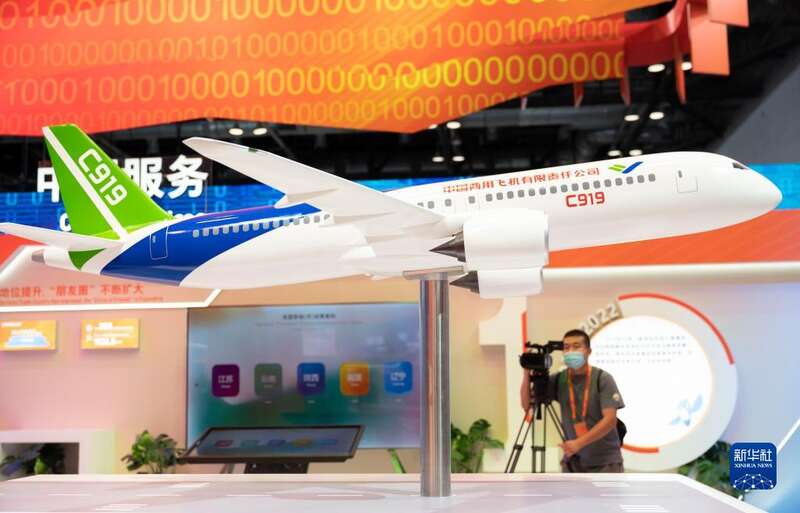 8月28日,在国家会议中心举行的服贸会媒体探营活动中,记者拍摄C919飞机模型。