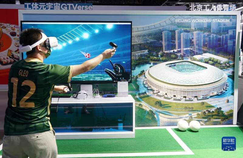 8月28日,在国家会议中心举行的服贸会媒体探营活动中,一名高通公司的工作人员展示工体元宇宙GTVerse。