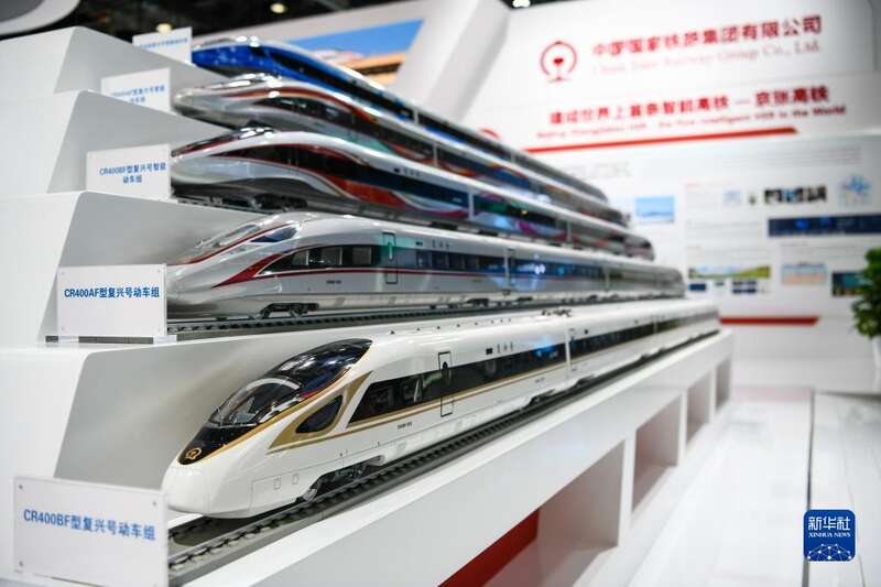 这是8月28日在国家会议中心服贸会媒体探营活动中拍摄的铁路主题展台。