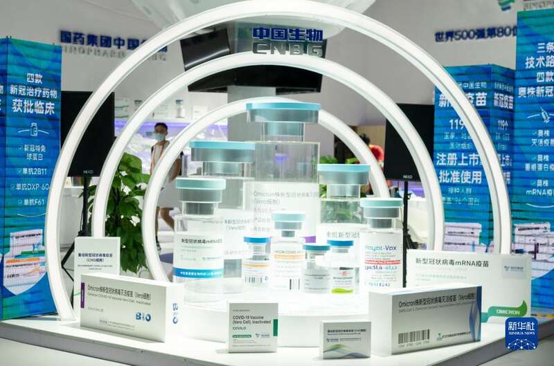 这是8月28日在国家会议中心服贸会媒体探营活动中拍摄的中国生物展台。