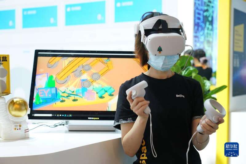 8月28日,在国家会议中心一期,2022年服贸会一家展台的工作人员通过VR设备进行沉浸式元宇宙协作绘画演示。