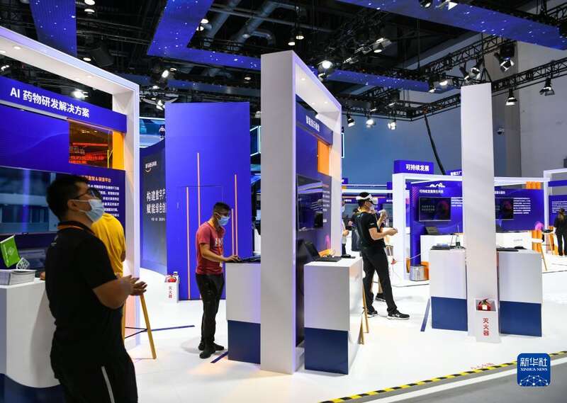 8月28日,在国家会议中心举行的服贸会媒体探营活动中,人们在展区参观。
