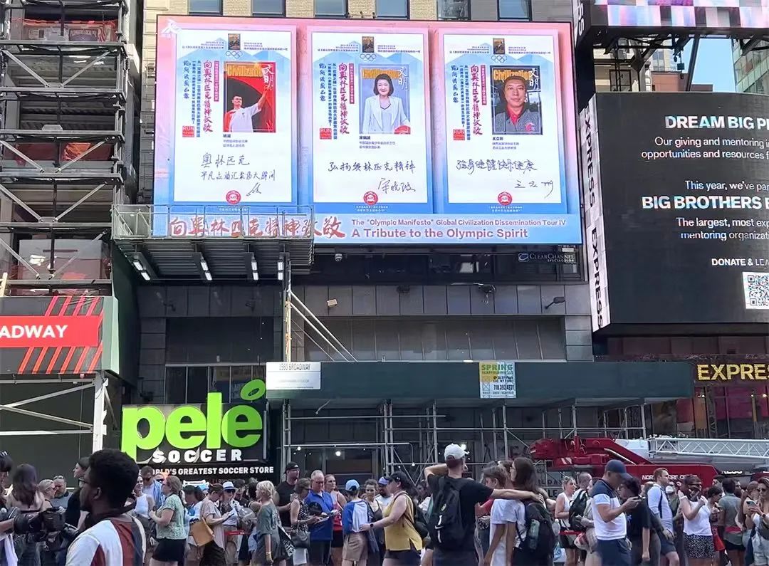 ▲社会各界代表和世界冠军参与向奥林匹克精神致敬活动的宣传海报在纽约时代广场大屏幕播出。