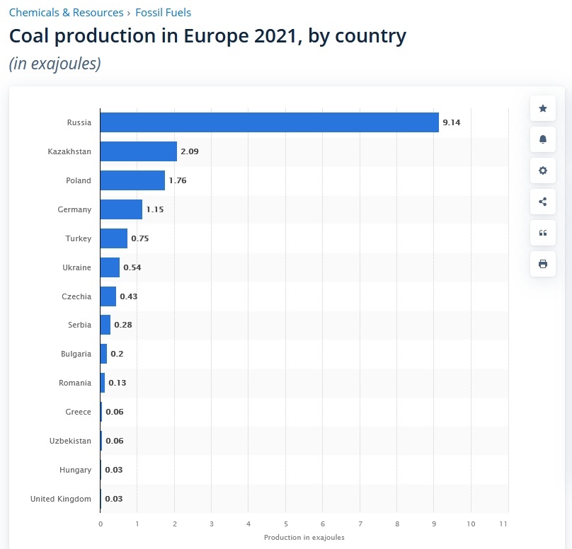 根据Statista数据,波兰和德国是欧盟2021年最大产煤国