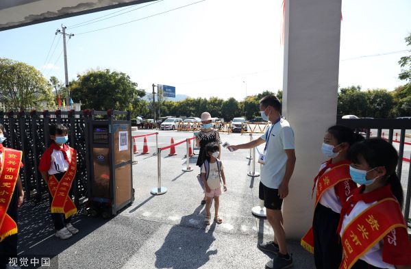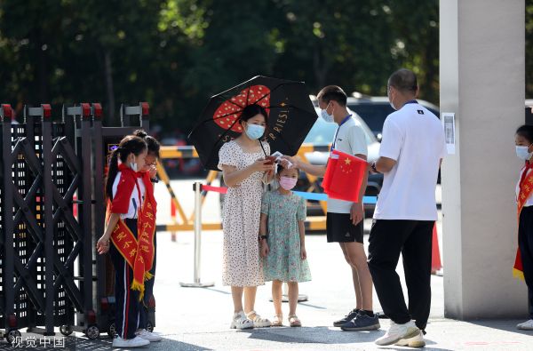 2022年8月29日,湖南资兴,四完小学的学生在家长的陪伴下重返校园,开启新学期的旅程。