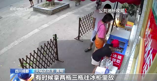 火锅店店主 黄明:前段时间因为天气特别热,成都有40多度,每天要差不多消耗七、八十瓶水,除了环卫工人、快递小哥,过路的人这些都会来取水。