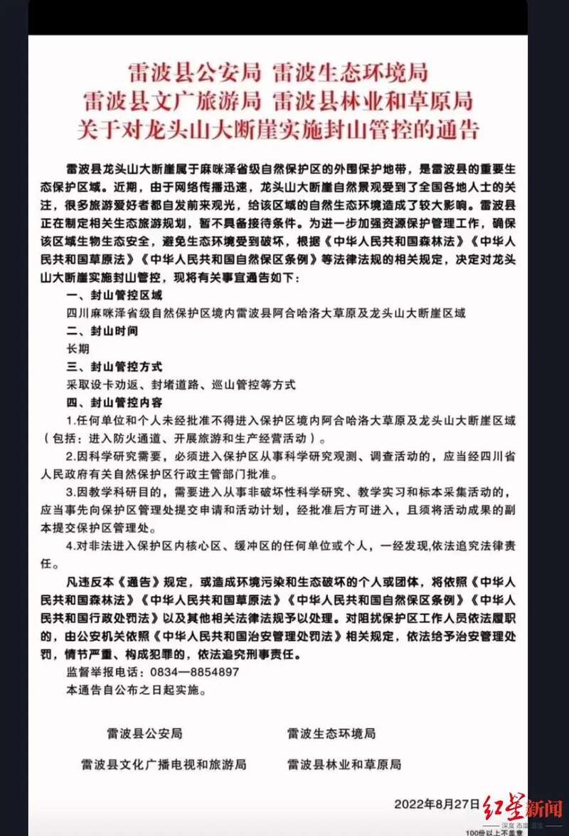 雷波县公安局、雷波县生态环境局、雷波县文广旅游局、雷波县林业和草原局等部门发布通告称,“雷波县龙头山大断崖属于麻咪泽省级自然保护区的外围保护地带,是雷波县的重要生态保护区域。”