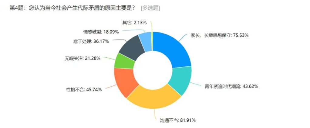 在调查问卷中,高占比的人群认为长辈与孩子产生矛盾的原因是“家长、长辈思想保守”和“二者之间沟通不当”。
