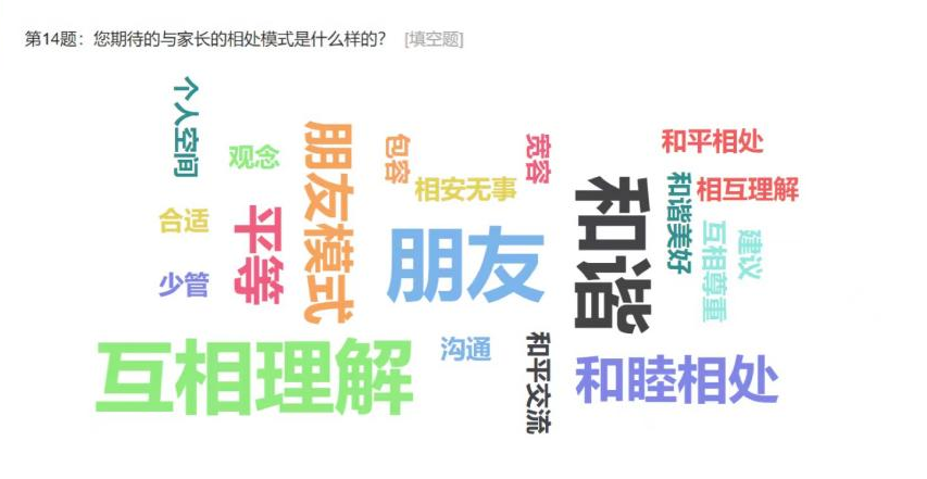 正如问卷调查中“你所期待的与家长/孩子的相处模式是什么样的”,所展现的词云图大多围绕着“互相理解”“朋友模式”“平等包容”以及“和睦相处”,寻找到彼此间最舒适的相处方式正是站在代沟两端的家长和孩子共同期待的。
