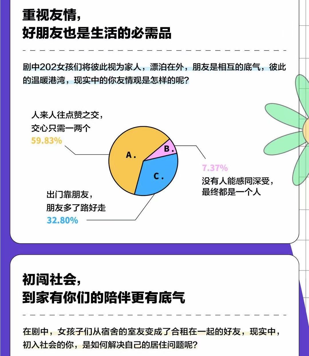 女孩们的情感话题当然也颇受关注。剧中女孩们将彼此视为家人,漂泊在外,朋友是相互的底气,彼此的温暖港湾,现实中的你友情观是怎样的呢?59.834%认为,“人来人往点赞之交,交心只需一两个。”32.788%认为,“出门靠朋友,朋友多了路好走。” 7.378%的人认为,“没有人能感同深受,最终都是一个人。”
