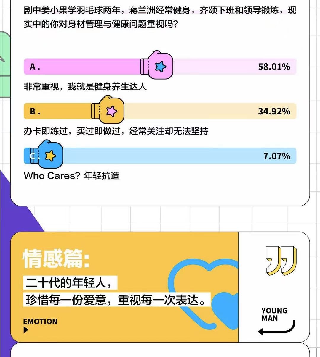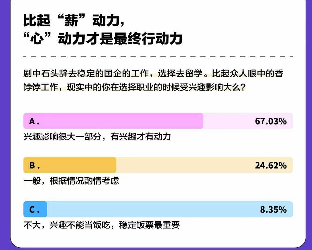 现在的年轻人为啥不爱吃鸭脖了,不爱喝奶茶了,关于年轻人的话题不断登上热搜,更多问题,可以从这部剧中找到代入感。正在热播的后青春世代生活职场剧《二十不惑2》豆瓣开分8.1分,讲述了四位女大学生,毕业后面临的职场和情感挑战。面对现实中的你遇到需要公开竞争的机会,会和前辈竞争么?现实中你能识别出老板的“画饼”行为吗?诸如此类情感和职场话题,年轻人也在调查中给出自己的答案。记者注意到,现实中这代年轻人更愿意选择有兴趣的工作和方向,面对竞争更有冲劲,面对有挑战性的机会,更愿意勇敢尝试竞争。面对生活和职场的矛盾和困惑,努力寻找到自己的生活方式。