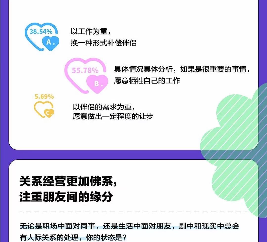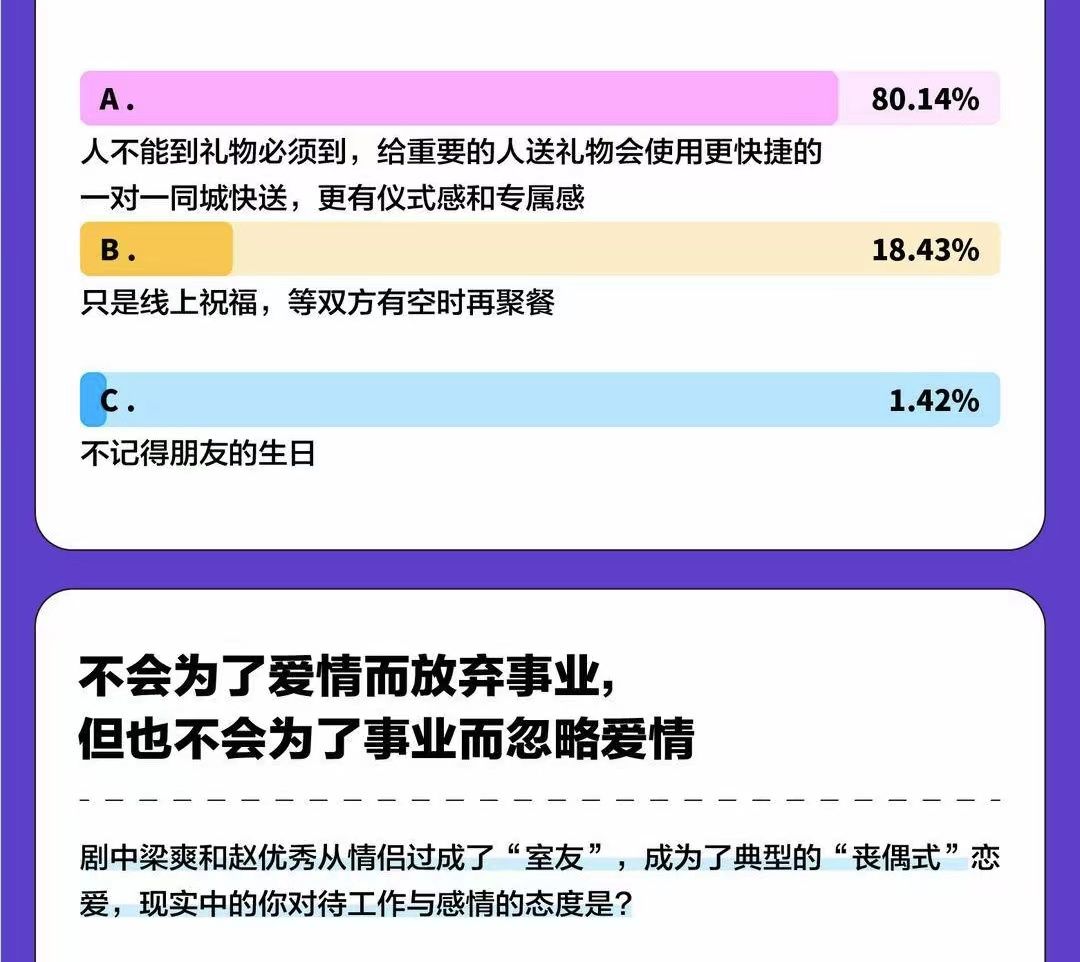 剧中关晓彤饰演的梁爽忙于电商直播,和摄影师男友赵优秀从情侣过成“室友”,成为典型的“丧偶式”恋爱,现实中的你对待工作与感情的态度是? 55.758%选择“具体情况具体分析,如果是很重要的事情,愿意牺牲自己的工作。”5.681%的网友,以伴侣的需求为重,愿意做出一定程度的让步。38.561%的认为,“以工作为重,换一种形式补偿伴侣。”