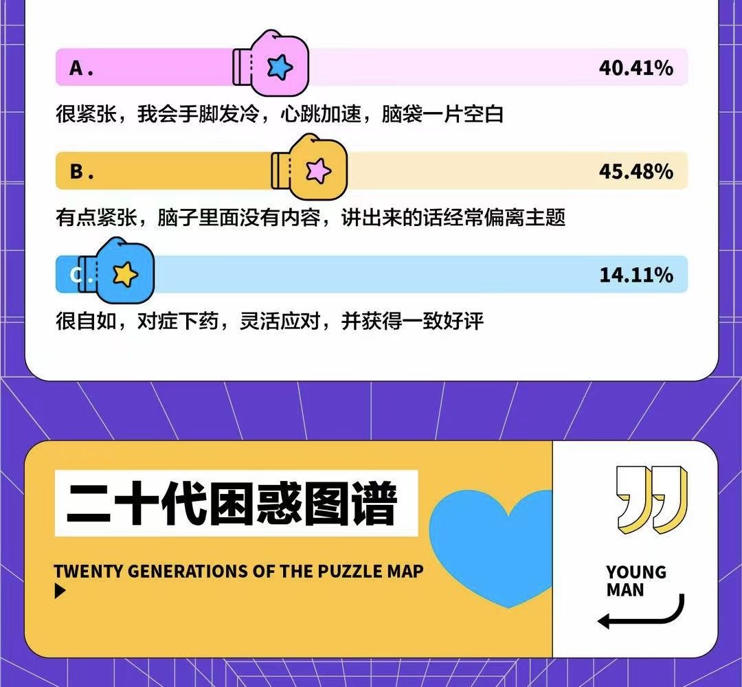 这张调查问卷发布了“二十代”困惑图谱,他们最担心,最困惑的,始终是对未来的规划。“升学深造还是就业?”“想安稳还渴望自由?”“ 研究生毕业后要考公还是找个公司上班呢?”面临的这些选择题,都是他们的内心真实写照。其次,薪资问题、职业困惑,都占有很大比例。有事业心的他们,情感困惑的占比排在工作之后。